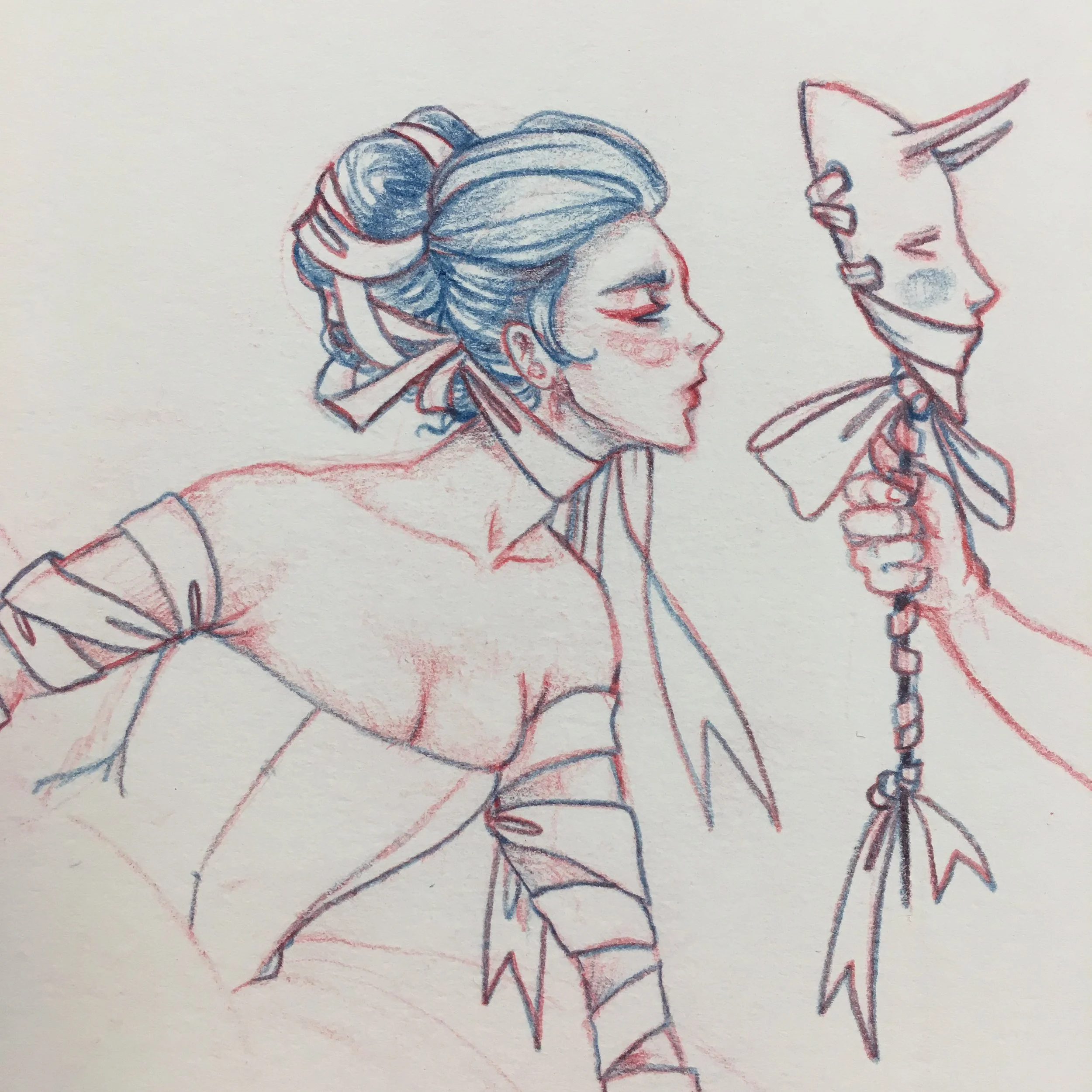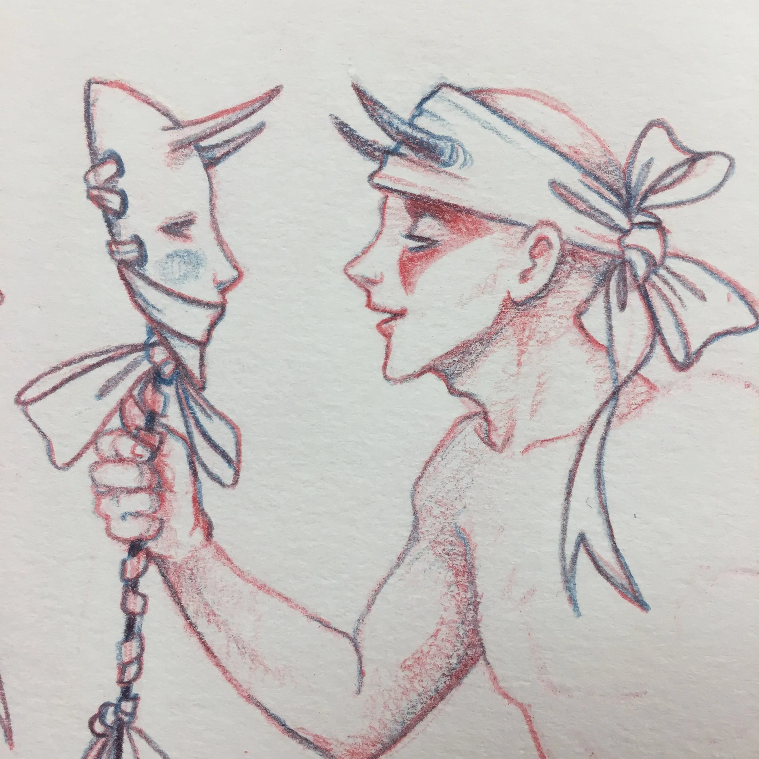 “Words hurt.” He withholds the arrow of love while she has been stung by his arrows of detest. Yet he still smiles, presenting her with the devil mask. So she must be the villain in this situation. A closer look reveals the mask is in fact a mirror of his own face, a projection he is forcing upon her. She grips the scissors, ready to cut the gag and break her silence.