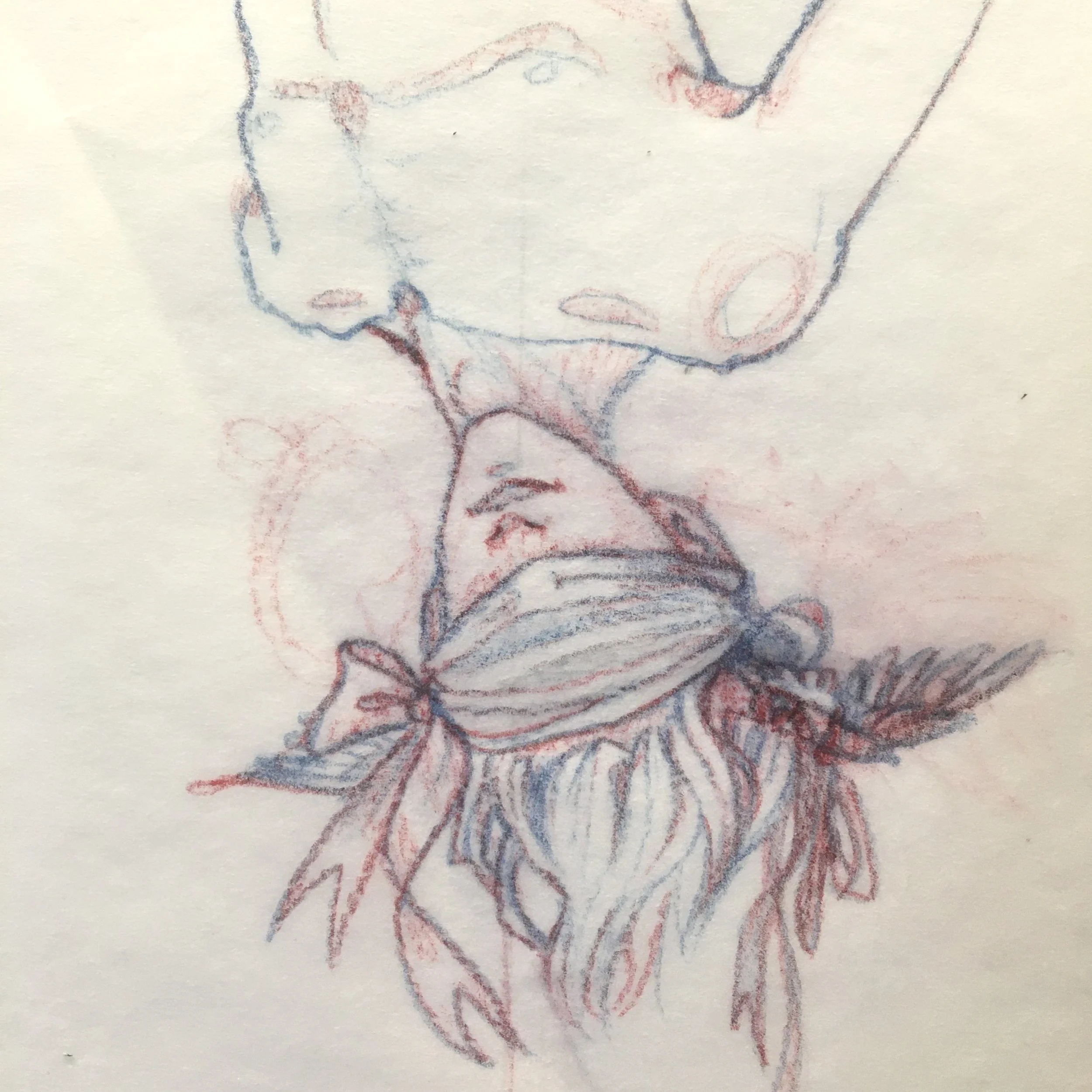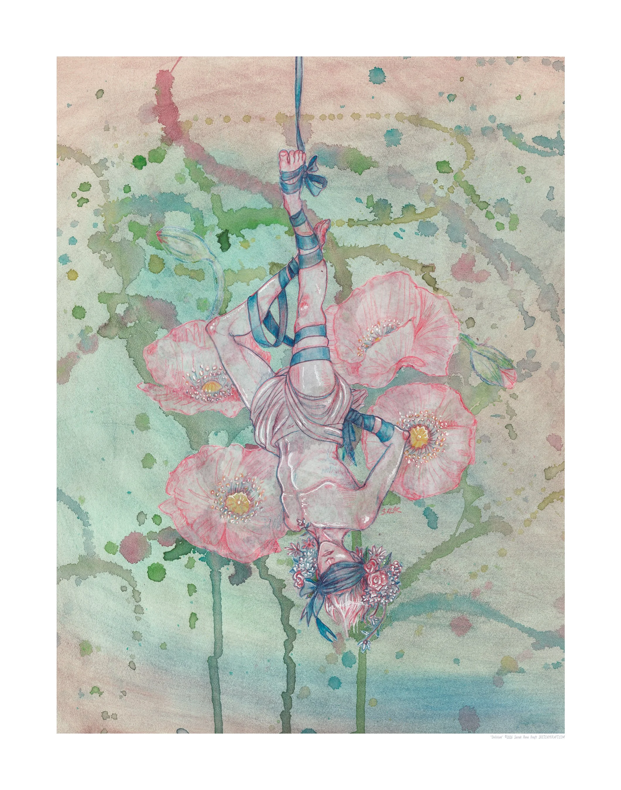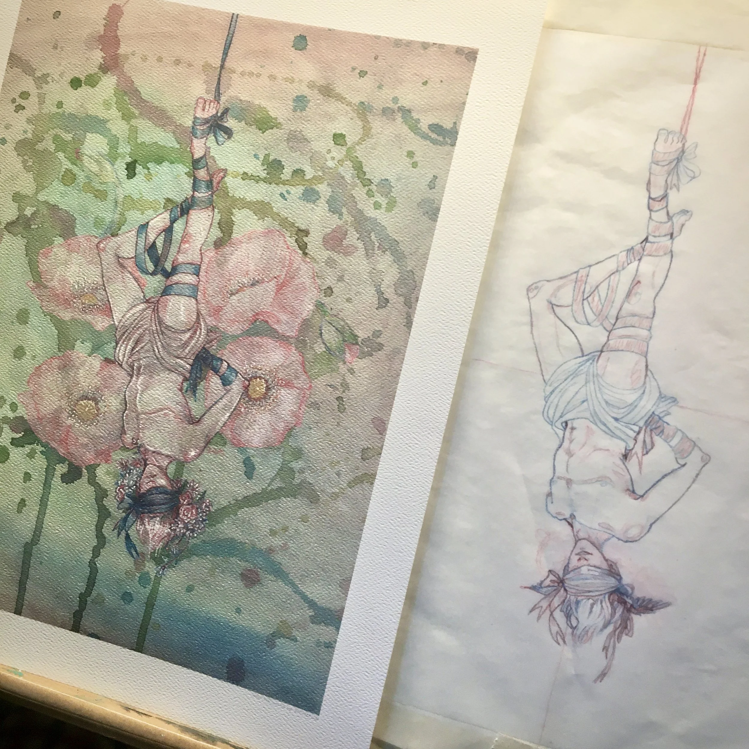 “Delirium” or “What Goes Up Must Come Down,” created in collaboration with artist Jim Shepherd for the EPHEMERAL group show hosted by Menagerie Sacramento (October 2016). Long before production of the Lemniscus Tarot, this piece was inspired by the imagery and themes of The Hanged Man in Tarot. Drawn on transparent vellum, manually cut out, and pasted with acid free book-binding glue over the abstract painting by Mr. Shepherd.