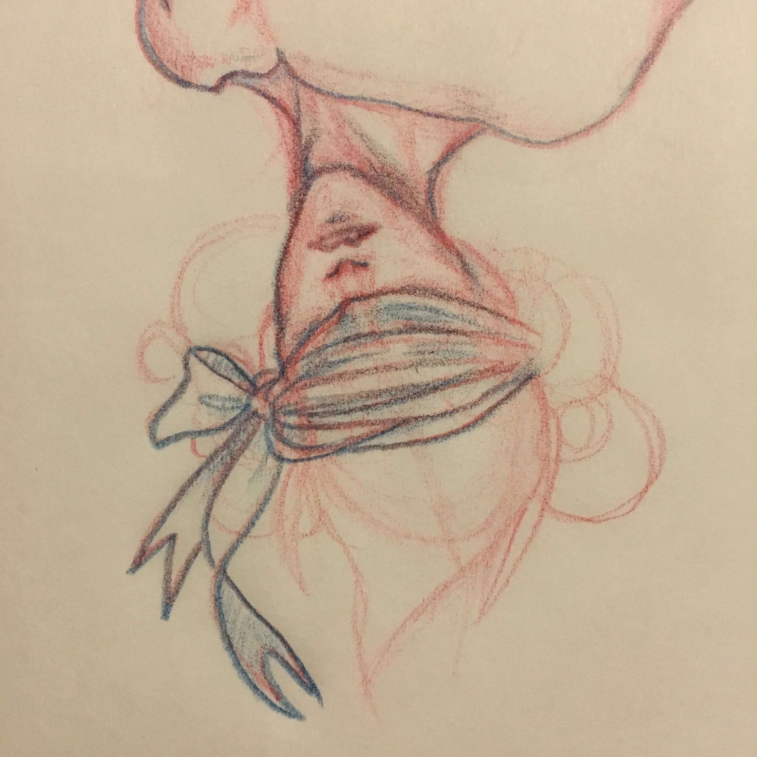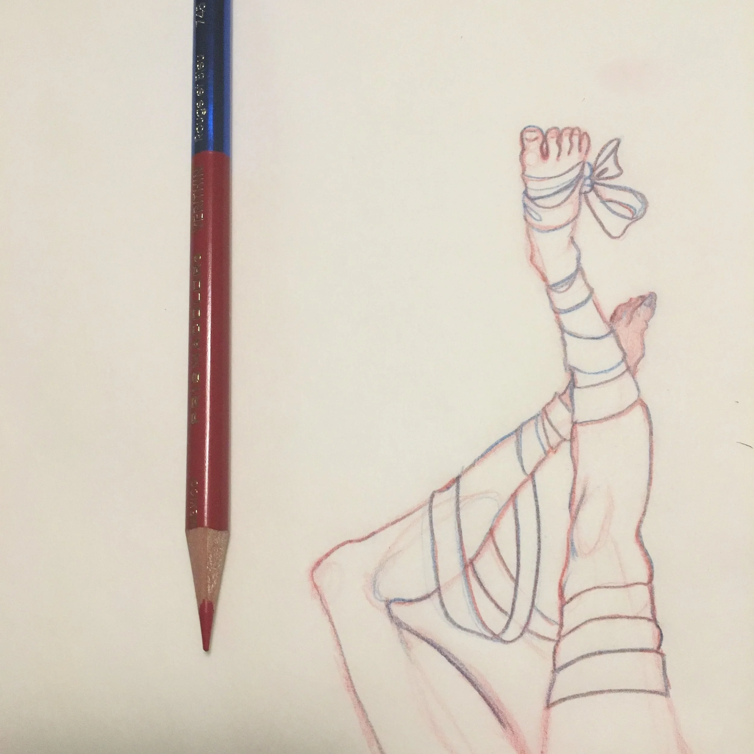Prismacolor Verithin red/blue colored pencil, Derwent Inktense pencils, white charcoal, and water brush on cold press watercolor paper.